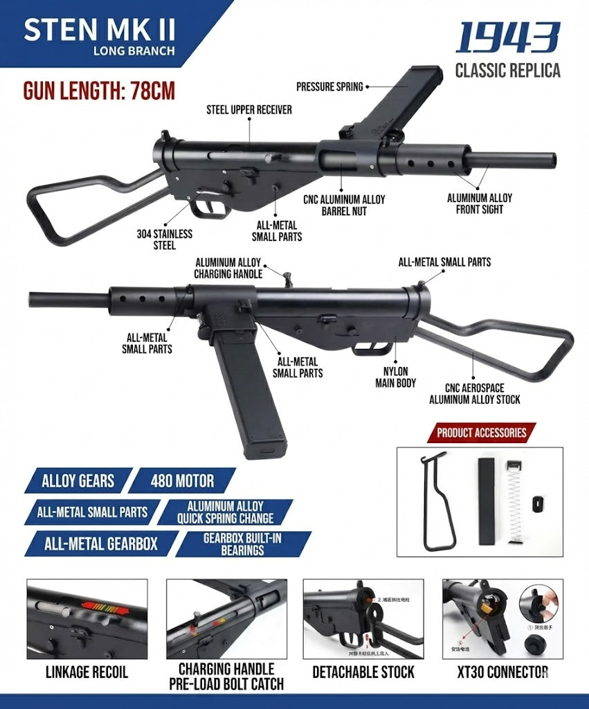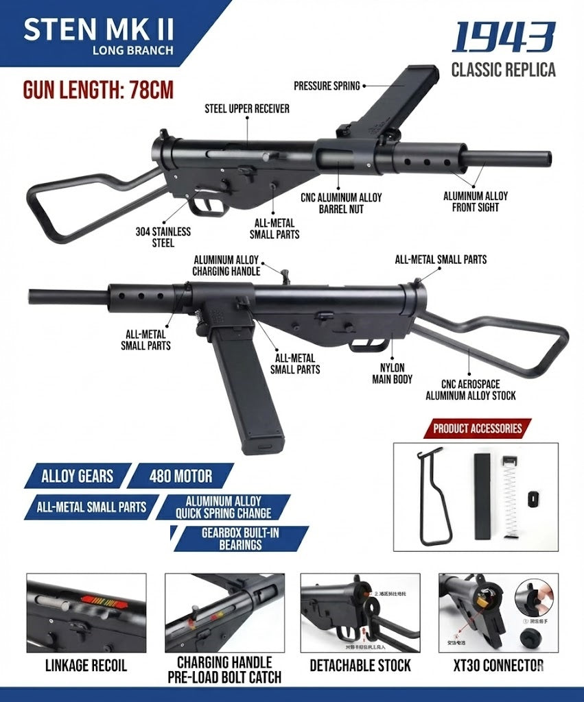 STEN MK II LONG BRANCH Gel Blaster Replica – 1943 Classic Reimagined Step into history with this meticulously crafted replica of the legendary STEN MK II submachine gun, modeled after the 1943 Long Branch variant. Designed for collectors and gel ball enthusiasts alike, this blaster combines vintage aesthetics with modern engineering. Key Features & Materials